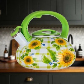 Zománcozott sípoló vízforraló 3 l-es SUN FLOWER acéllemezből készült, 2 rétegű zománc bevonattal és NAPVIRÁG stílusú dekorációval. A vízforraló kialakításához színben passzoló műanyag fogantyúval, kivehető síppal rendelkezik, az alja pedig a vízforraló használatára vonatkozó piktogramokkal van ellátva.