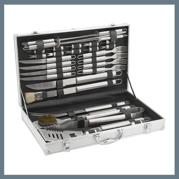 A készlet minden eszközt tartalmaz a különféle ételek elkészítéséhez, de grillezés után is. Minden db kiváló minőségű rozsdamentes acélból készült.
