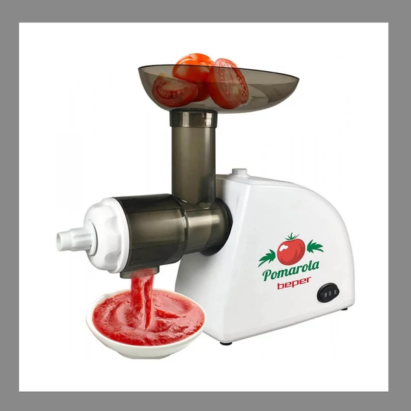 A Beper elektromos paradicsomfacsaró ideális paradicsomkonzerv, szószok, zöldséglevek és gyümölcslevek készítéséhez. Ha a paradicsomot a tálcára helyezi, a héjak automatikusan leválasztásra kerülnek a paradicsompürétől. A paradicsomnyomó előre- és hátramenettel és praktikus hordozó fogantyúval rendelkezik. Biztonsági intézkedésként a készülék túlmelegedés elleni védelemmel és csúszásmentes gumitalppal rendelkezik. A ház ABS műanyagból, a szűrő pedig rozsdamentes acélból készült. A szállításhoz tartozik egy műanyag tál és egy pépesítő.