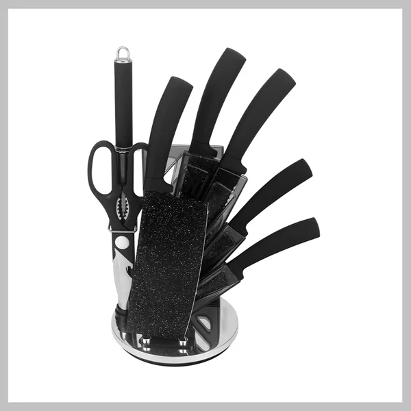 Kiváló minőségű, 8 darabos készlet átlátszó tartóban, inox színben. A kések markolata kényelmes használatot biztosít. A késtartó forgatható, így még kényelmesebben használható és helytakarékos. Elegáns kivitel, így a konyhád dísze lesz. Főzni szerető barátoknak, családtagoknak remek ajándék lehet.