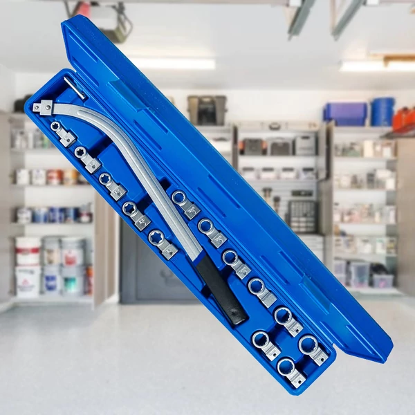 12 darab cserélhető 10-18 mm-es fejjel tudsz dolgozni, amelyek közül 8 sima és 4 torx, így minden körülmény között helyt állhatsz. A kulcs maga 455 mm hosszú és enyhén hajlított, hogy pár laza mozdulattal kikaphasd azokat a csavarokat, amik a leginkább el akarnak rejtőzni előled, a Cr-V (chrome-vanadium) acél ötvözetnek köszönhetően pedig nem kel aggódni, hogy meghajlik vagy eltörik a kulcs.