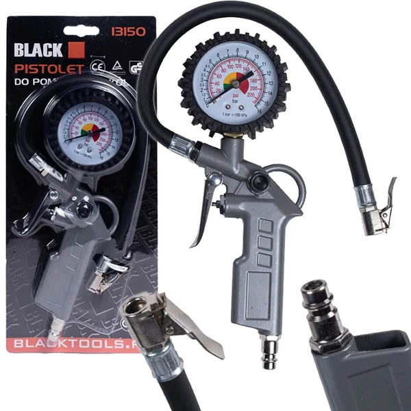 1/4 col levegőcsatlakozással ellátott 12 bar nyomásig kalibrált nyomásmérővel kombinált pisztoly, gumiabroncsok pontos felfújásához.