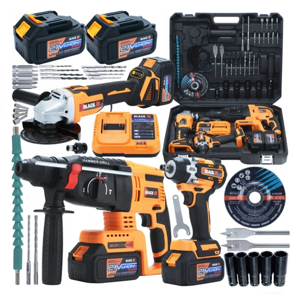A BLACK márkájú akkumulátoros szerszámkészlet teljes körű megoldást nyújt profiknak és barkácsolóknak egyaránt. A készletben megtalálható az ütvefúrókalapács, a sarokcsiszoló, az ütvecsavarozó és számos tartozék, így sokoldalú felhasználást biztosít az építőiparban, szerelési és felújítási munkáknál.