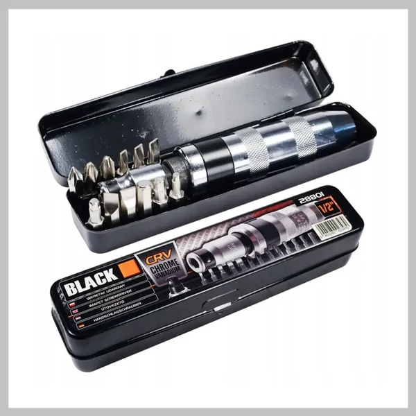 BLACK pneumatikus ütvecsavarhúzó készlet, cserélhető chrome-vanadium bittel és bitfejekkel, fém tárolóban – 28801
