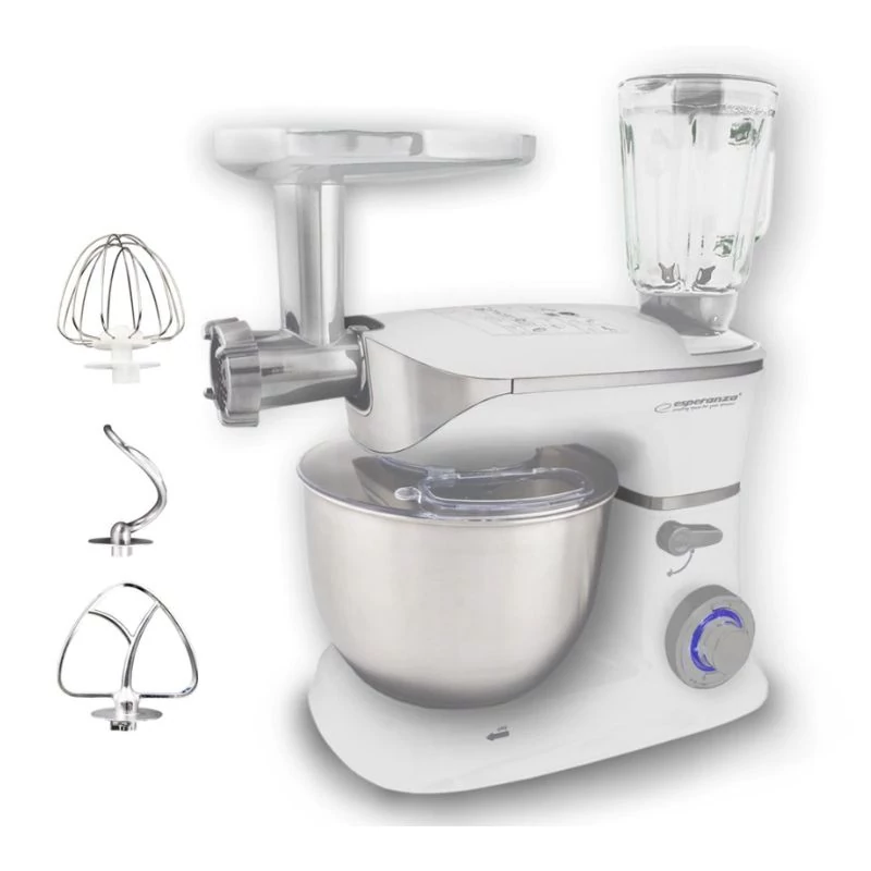 Professzionális, 1000 wattos teljesítményű bolygómixer, amely tökéletes választás minden modern konyhába. Erős motorjának, hatfokozatú sebességszabályozásának és számos tartozékának köszönhetően egyetlen készülékben ötvözi a dagasztó, keverő, habverő, húsdaráló és turmixgép funkciókat. Ideális sütéshez, főzéshez, valamint hús- és zöldségfeldolgozáshoz.