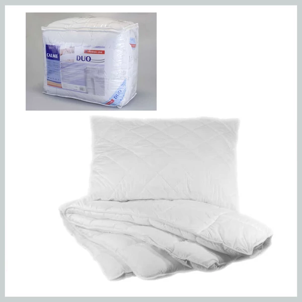 A CALME THERMO LINE Duo párna és paplan szett egy két rétegű, rendkívül meleg steppelt takarót tartalmaz (140 x 200 cm), valamint egy párnát (70 x 90 cm). A takaró töltete szilikonizált poliészter szál, amelynek súlya 1600 g.