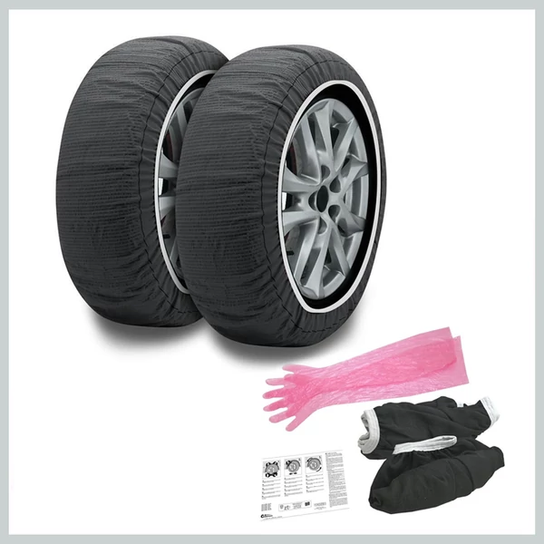A csomag tartalma: egy tengelyre való szett (2 textil lánc), egy pár hosszú ujjú műanyag kesztyű és használati útmutató.