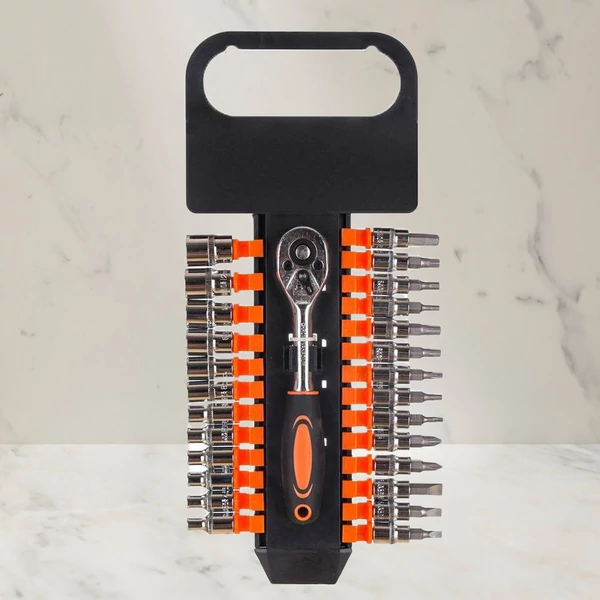 A 27 részes BECKFORD racsnis és hosszabbító készlet egy praktikus készlet anyák és csavarok lazításához és meghúzásához. A különböző méretű bitek biztosítják, hogy minden anya- és csavarméret lefedve legyen.