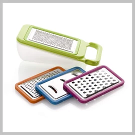 4 részes reszelőkészlet tálcával, hossza 26 cm, szélessége 10,2 cm, magassága 10,8 cm, rozsdamentes acél sziták.