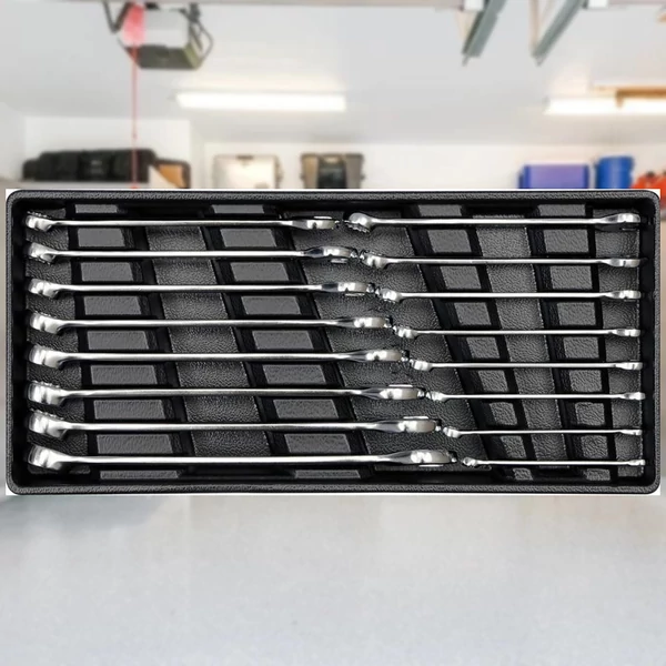 16 db CrV acél gyűrűs kulcs készlet. Az AS-DRIVE funkció nagyobb érintkezési erő kialakítását teszi lehetővé, mivel a csavarral való érintkezés nem a hatszög szélein, hanem az érintkezési felületek első harmadában történik.