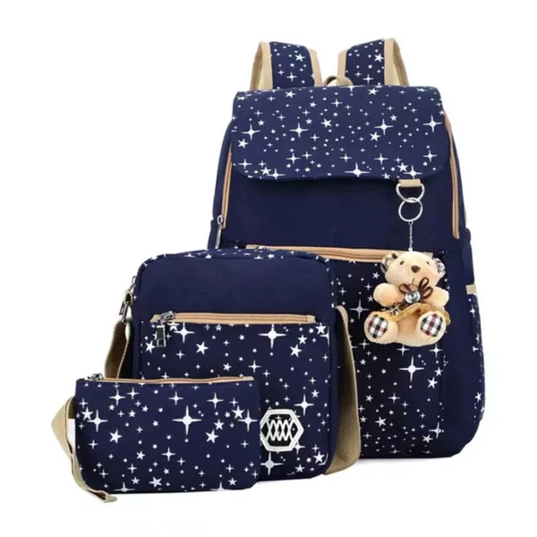 Ez a vidám és praktikus iskolatáska szett kiváló választás iskolakezdéshez, utazáshoz vagy hétköznapi használatra. A szett három különböző méretű és funkciójú táskából áll, amelyek azonos színűek és csillagmintás díszítéssel vannak ellátva – így nemcsak hasznosak, hanem stílusosan is összeillenek.