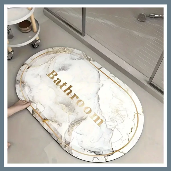 Varázsold különlegessé fürdőszobádat ezzel az elegáns, ovális formájú fürdőszobai szőnyeggel, amely stílusos „bathroom” felirattal és exkluzív arany márvány mintával díszített. A szőnyeg fehér alapszíne letisztult, modern megjelenést kölcsönöz, míg a csúszásgátló hátoldal biztonságos használatot biztosít a nedves padlón is. Kiváló választás azok számára, akik egyszerre keresnek praktikus és dekoratív kiegészítőt fürdőszobájukba.