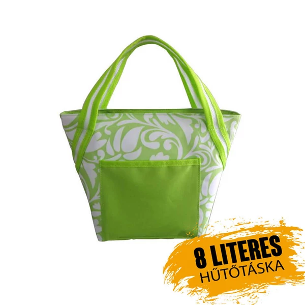 Hűtőtáska 8 l zöld, fehér virágokkal. Külső anyag - rendkívül tartós poliészter, belső anyag - szigetelőréteg PE hab. A belső része nagyon könnyű karbantartást és tisztítást tesz lehetővé élelmiszer-szennyeződés esetén.