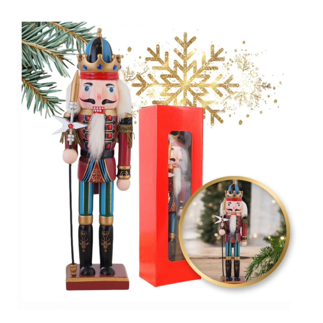 Klasszikus diótörő figura, amely elegáns kiegészítője a karácsonyi dekorációnak. A részletgazdag kidolgozás, a koronás fejfedő és a díszes ruházat igazi ünnepi hangulatot teremt otthonodban. A 30 cm magas diótörő tartós fából készült, és stabil talapzattal rendelkezik, így bármilyen asztalon, polcon vagy a karácsonyfa mellett jól mutat.