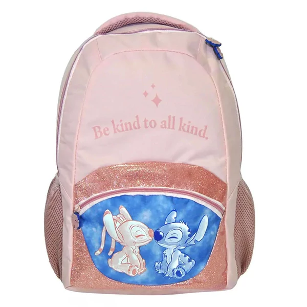 Kedves, rózsaszín árnyalatú iskolatáska csillogó elemekkel, és Lilo & Stitch karakterekkel díszítve. A „Be kind to all kind” felirattal a pozitív üzenet is része a dizájnnak. Ideális kisebb gyerekek számára mindennapi iskolai vagy óvodai használatra.
