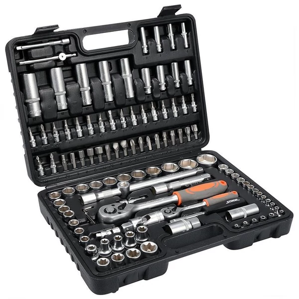 Praktikus, hordozható kofferben elrendezett, professzionális minőségű gola készlet. A csomag tartalmaz két racsnit, számos bitet, adaptert, valamint 1/2" és 1/4" hosszabbítókat, mindegyik átlátható helyen tárolva.