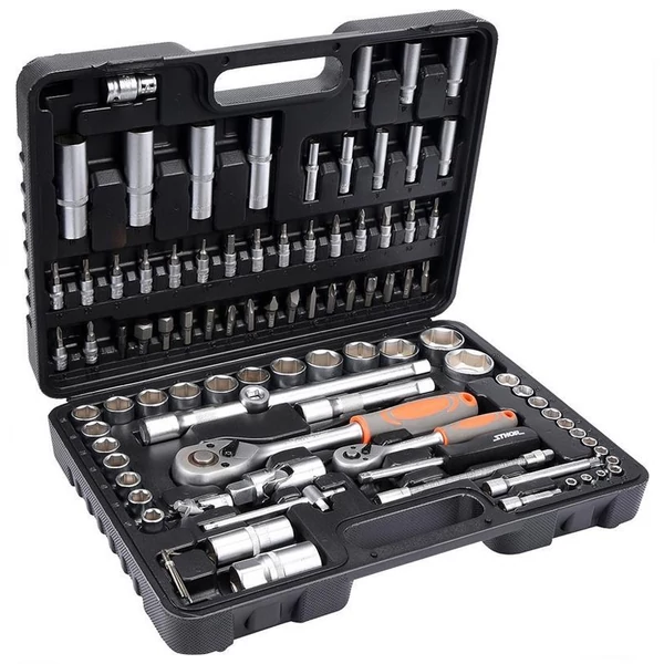 Praktikus, hordozható kofferben elhelyezett, minőségi gola készlet. A csomag tartalmaz két racsnit, számos bitet, adaptert, 1/2" és 1/4" hosszabbítókat, mind átlátható rendszerezésben.
