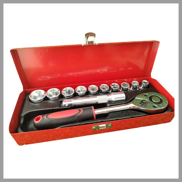 Ez a masszív kivitelű dugókulcs készlet praktikus választás otthoni és professzionális felhasználásra egyaránt. A fém racsnis hajtókarral és különböző méretű dugókulcsfejekkel ellátott szett egy erős piros lakkozott acél szerszámdobozban kapott helyet, amely biztonságosan zárható, és könnyen szállítható.