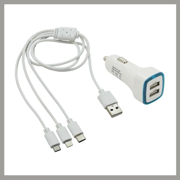 Dupla USB Autós Töltő + 3 az 1-ben Töltőkábel – Micro USB, USB-C, iPhone Kompatibilitás 07683