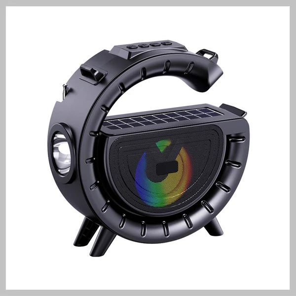2. Főbb funkciók: FM rádió, Bluetooth 5.3, TF/U lemez lejátszás, USB, zseblámpa, színes atmoszféra lámpa, napelemes töltés