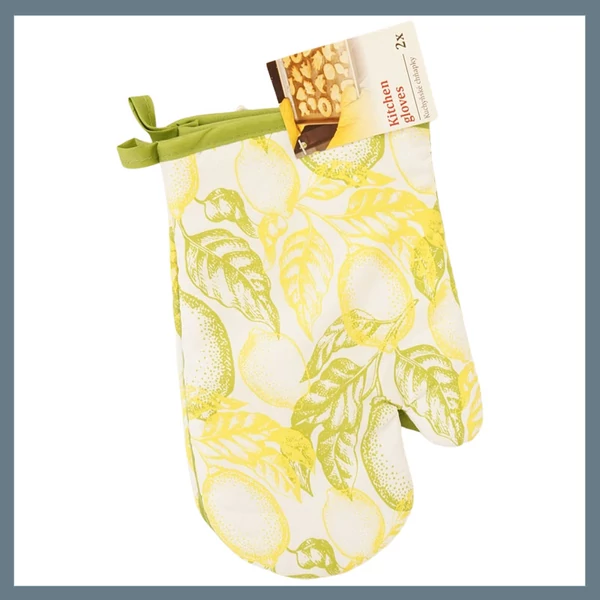 Sárga levélmintás edényfogó kesztyű, praktikus és stílusos konyhai kiegészítő, amely védi a kezet a forró edények és serpenyők kezelése közben.