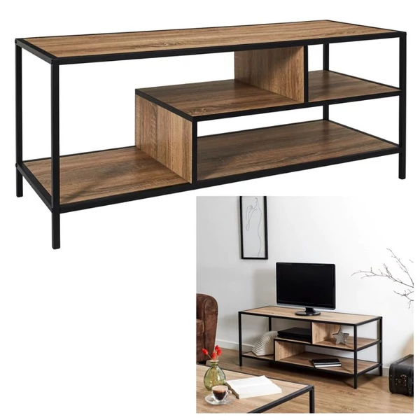 Ez a modern televízióállvány egyszerre praktikus és stílusos kiegészítője lehet bármely nappalinak. A fekete színű fémváz és a fa hatású polcok elegáns kontrasztot alkotnak, ami tökéletesen illeszkedik a kortárs lakberendezési trendekhez. Az állvány 3 nyitott polccal rendelkezik, amelyek lehetővé teszik a különféle elektronikai eszközök, könyvek vagy dekorációk elhelyezését. Az asztal középső részén található egy zárt tárolóegység, amely a rend fenntartásában segít, miközben esztétikus megjelenést biztosít. A könnyed, de stabil kialakítás ideális választás kisebb helyiségekbe is, ahol a praktikum és a dizájn egyaránt fontos.
