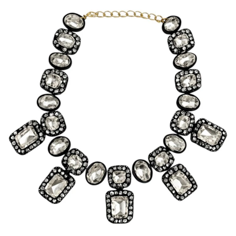 Ez a különleges, feltűnő nyaklánc tökéletes kiegészítő elegáns eseményekhez, de akár a hétköznapi öltözékeket is feldobja. Nagy méretű, csillogó kristályai és fekete alapja modern, mégis elegáns megjelenést biztosítanak.