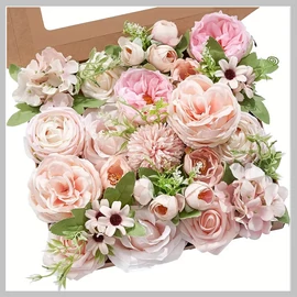 Ez a gyönyörű, világos rózsaszín árnyalatokban pompázó művirág csokor tökéletes választás esküvői dekorációkhoz, asztaldíszekhez, fotóháttérhez, DIY kézműves projektekhez vagy bármilyen esemény elegáns díszítéséhez. A szett különféle virágokat tartalmaz – rózsákat, pünkösdi rózsákat (peoniekat), dáliákat és más díszítőelemeket –, természetes hatást keltve, hosszú élettartammal.