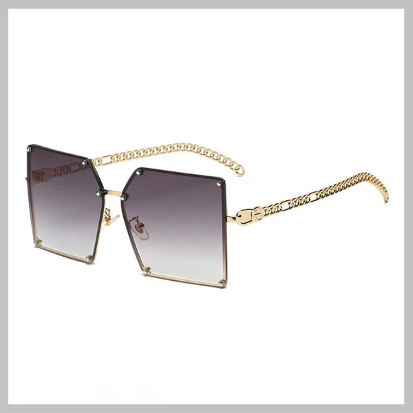 Stílusos és feltűnő megjelenésű, nagy lencsés elegáns női napszemüveg arany színű láncos szárakkal. Ez a modern, különleges fazon garantáltan kitűnik a tömegből, miközben UV400 védelemmel óvja a szemedet a káros napsugaraktól.