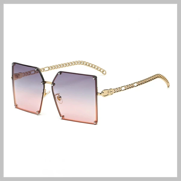 Stílusos és feltűnő megjelenésű, nagy lencsés elegáns női napszemüveg arany színű láncos szárakkal. Ez a modern, különleges fazon garantáltan kitűnik a tömegből, miközben UV400 védelemmel óvja a szemedet a káros napsugaraktól.