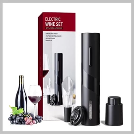 A négy darabos készletben a 4 db AA ceruzaelemmel működő elektromos dugóhúzó mellett találunk a fólia eltávolítását megkönnyítő eszközt, a megbontott bor tárolásához elengedhetetlenül szükséges dugót, és az üveg nyakához csatlakoztatható kiöntőt is.