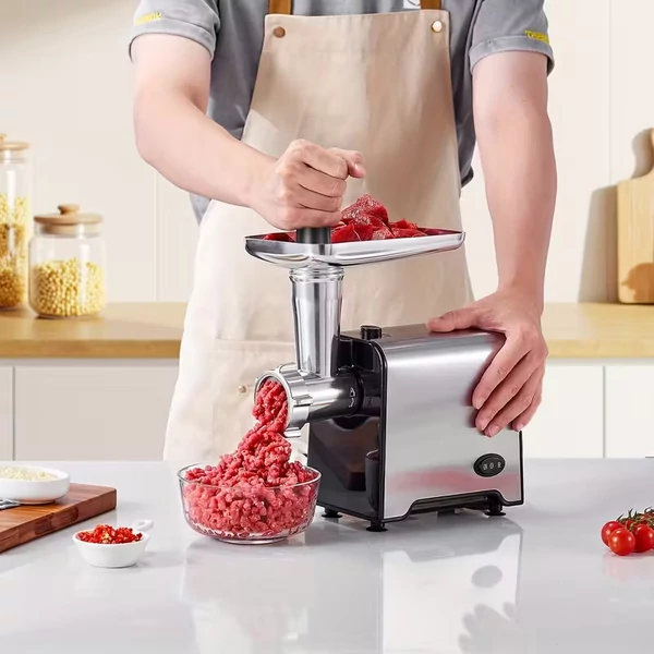 Ez a nagy teljesítményű elektromos húsdaráló ideális választás friss darált hús készítéséhez otthon. A három cserélhető vágótárcsa lehetővé teszi különböző finomságú darálást, így mindig az ételnek megfelelő állagot érhetünk el. Erős motorjának és rozsdamentes acél kialakításának köszönhetően tartós és hatékony konyhai eszköz.