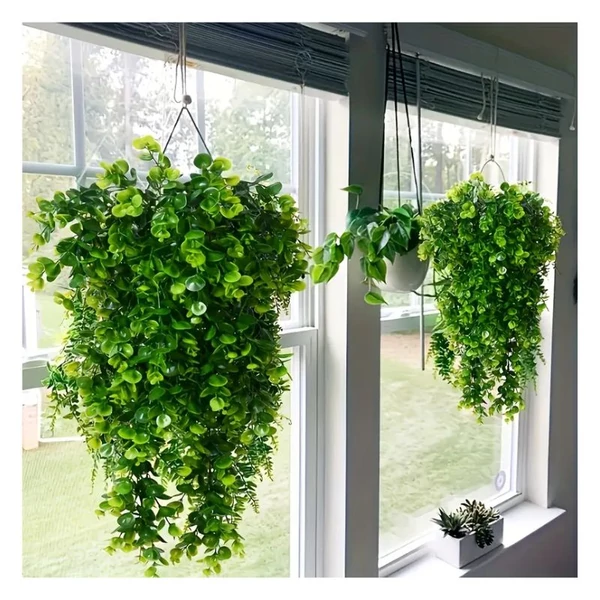Mesterséges futónövény dekoráció, amely élethű zöld levelekkel rendelkezik. A lombozat sűrű és dús hatást kelt, különböző árnyalatú zöld levelekkel, amelyek természetes megjelenést biztosítanak. A műnövény ideális beltéri és kültéri díszítéshez, például falak, polcok, erkélyek vagy esküvői dekorációk kiegészítésére.