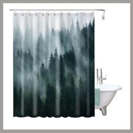 Varázsold természetközeli hangulatúvá fürdőszobádat ezzel a lenyűgöző, ködös fenyőerdőt ábrázoló zuhanyfüggönnyel! A részletgazdag nyomtatás és a nyugtató színvilág elegáns és relaxáló környezetet teremt a mindennapi tisztálkodáshoz.