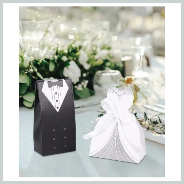 Varázsold el vendégeidet stílusos és romantikus kiegészítőkkel! Ez a különleges esküvői ajándékdoboz szett egy menyasszonyi ruha és egy szmoking formájú dobozból áll, amely tökéletes választás köszönetajándékok, bonbonok vagy kis emléktárgyak stílusos csomagolásához.