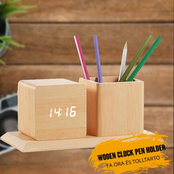 Letisztult, elegáns megjelenésű, sötét fa mintázatú többfunkciós asztali óra és eszköztartó. A csomagban található kábel segítségével USB portról működtethető, vagy pedig 3 db AAA elem szükséges a használatához.