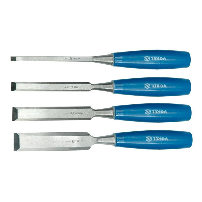 A vésők pengéi kiváló minőségű CrV acélból készültek. Az egyes szerszámok különböző szélességűek: 6 mm, 12 mm, 18 mm és 24 mm.