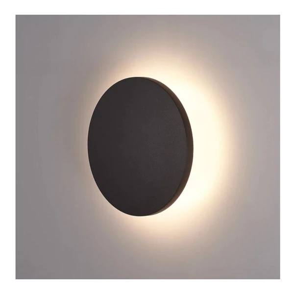 Modern, minimalista kialakítású kerek fali lámpa, amely elegáns fekete előlappal és teljes felületű, hátulról sugárzó fényével hangulatos megvilágítást biztosít. Tökéletes választás nappaliba, hálószobába vagy folyosóra, ahol dekoratív, mégis funkcionális fényforrásra van szükség.