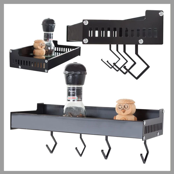 Falra rögzíthető konyhai polc akasztókkal, 30x13x5,5cm, fekete 24253