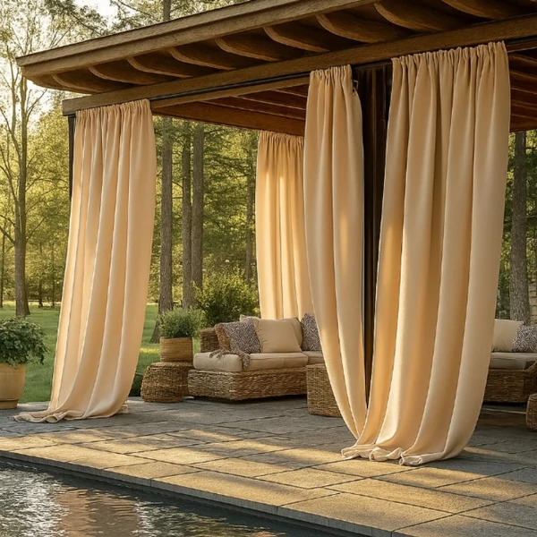 Ez a stílusos, világos színű függöny ideális választás pergolákhoz, teraszokhoz vagy kerti pihenőhelyekhez. A vastag, mégis lágy esésű textil hatékonyan árnyékol, miközben meghitt, elegáns légkört teremt a szabadtéri térben.