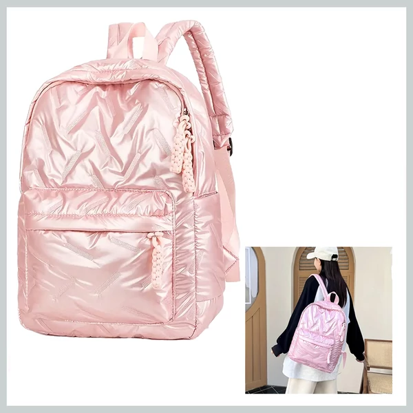 Ez a modern és stílusos steppelt hátizsák különleges, metálos fényű rózsaszín színével és párnázott kialakításával ideális választás mindennapi városi használatra, utazáshoz vagy akár sportos megjelenéshez. A fényes anyag és a dekoratív varrás különleges megjelenést kölcsönöz a táskának.