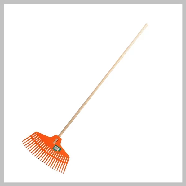 Könnyű levél gereblye tartós műanyagból és fenyő nyélből.