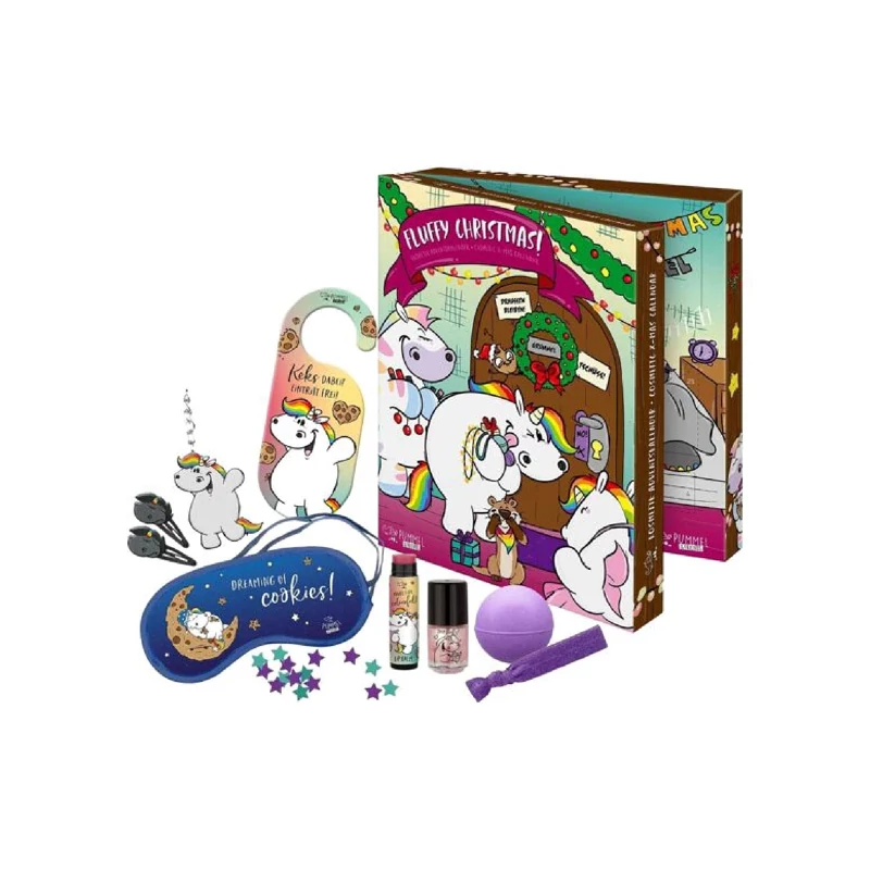A Fluffy Christmas! Adventi Naptár egy bájos, karácsonyi ajándékcsomag, amely 24 különböző meglepetést rejt a gyerekek számára, mindegyik egy-egy napi ajándék a decemberi várakozáshoz. A naptár a színes unikornisok és karácsonyi témák köré épül, és a gyerekek minden nap egy új, vidám ajándéknal találkozhatnak. A naptár olyan kozmetikai és apró ajándékokat tartalmaz, mint például fürdőgolyók, csillámpor, ajakápolók és más szórakoztató kiegészítők.