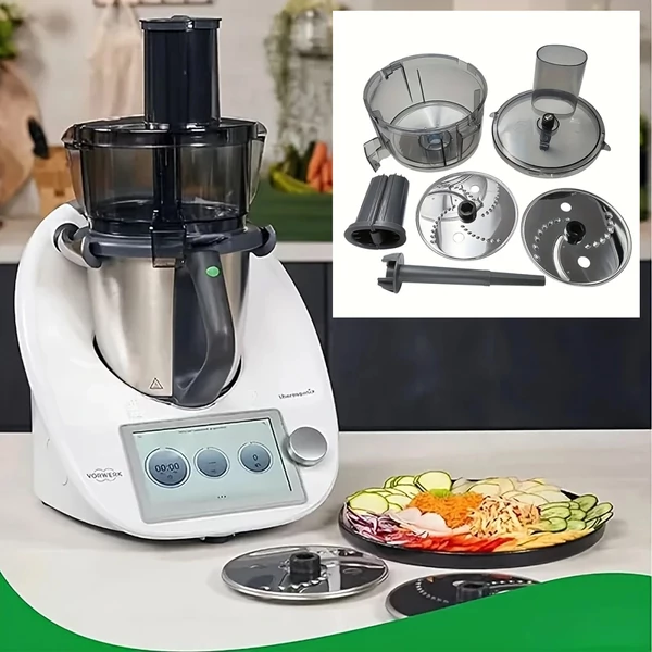 Ez a sokoldalú és időtakarékos zöldségszeletelő és -reszelő ideális kiegészítő a Thermomix készülékhez, amely gyorsan és hatékonyan feldolgozza a zöldségeket, gyümölcsöket vagy sajtokat. Cserélhető pengékkel és külön kosárral rendelkezik, így mindenféle szeletelési és aprítási igénynek megfelel.