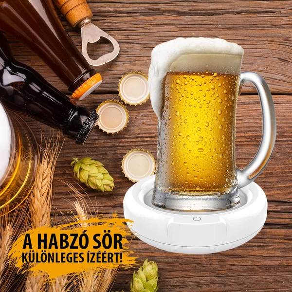 Nagyon egyszerű a működése. Tegyél egy kanál vizet az eszköz lapjára, helyezd a poharat a lapra, majd töltsd meg jéghideg sörrel. Nyomd meg a bekapcsoló gombot és néhány pillanat alatt kész a hab a sörödben!