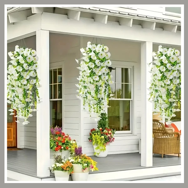 Dobd fel otthonod, erkélyed vagy verandád megjelenését ezzel a lenyűgöző, élethű függő művirág dekorációval! A gazdag zöld lombozat és a dús fehér virágok természetes hatást keltenek, miközben nem igényelnek öntözést vagy gondozást.