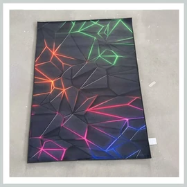 Geometriai mintázat kontrasztos fekete alapon, RGB neon színátmenetekkel (piros, lila, zöld, narancs, kék). Különösen jól mutat LED-világítás mellett.