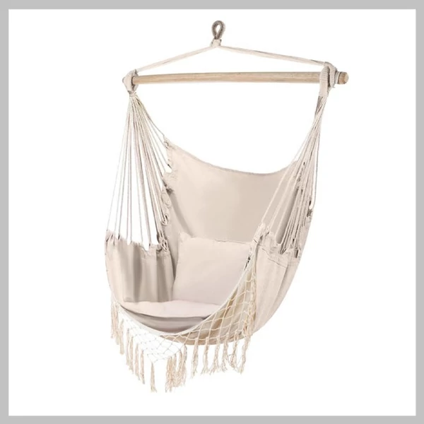 TARTÓS ANYAG - pamut gondoskodik a megfelelő szellőzésről, ami növeli a függőszék használatának kényelme még forró napokon is. A keveréke poliészter felelős az ülés tartósságáért. Szolíd szerelőgyűrű -hoz kapcsolódik tartós kötelek, egyenletesen elosztva a függőágy oldalain egy fa keresztrúdon keresztül. Ez a design teszi könnyen felakasztható, és a függőágy az kiegyensúlyozott és stabil.