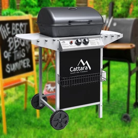 A grillsütő mobil (2 kerék), csuklós fedéllel és mindkét oldalán tárolópolcokkal van felszerelve. A gázpalackhoz csatlakozó tömlő és egy nyomáscsökkentő szelep is tartozik hozzá. A lehajtható oldalsó polcoknak köszönhetően a grill könnyen tárolható.