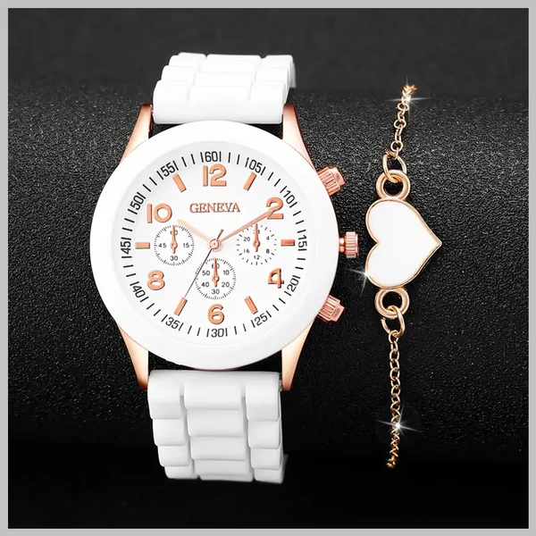 Elegáns ajándékkészlet – szilikon szíjas kvarc karóra világtérképes számlappal és szív alakú karkötővel – nőies kiegészítő hétköznapokra és különleges alkalmakra